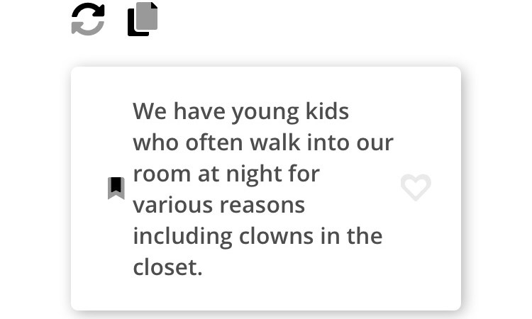 We have young kids who often walk into our room at night for various reasons, including clowns in the closet. Sometimes we humor them by going to check together as a family. Other times, we just tell them it’s fine and let them sleep in our bed.